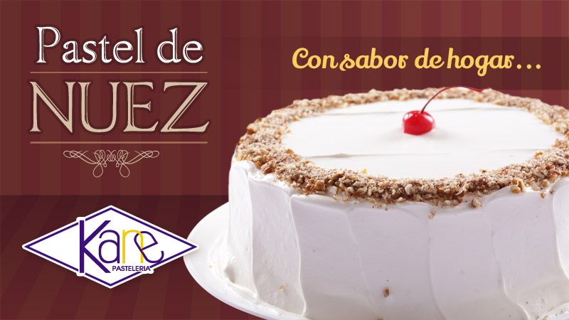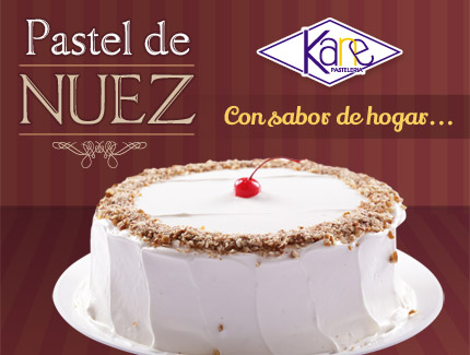 • Pastel de Nuez Suave pastel con trozos de nuez, cubierto con betún elaborado a base de crema con un toque de vainilla, decorado con nuez molida y una cereza al centro.