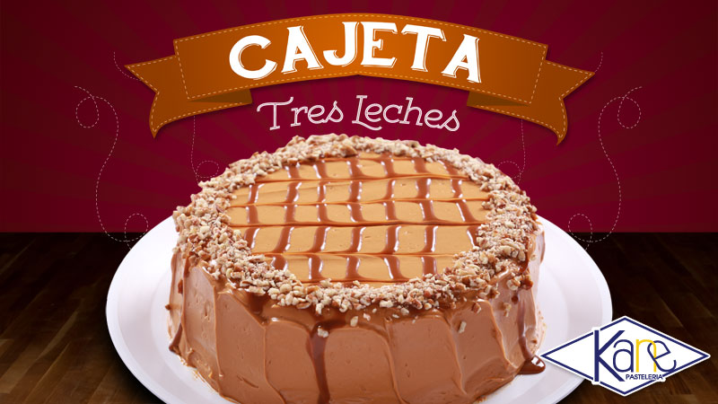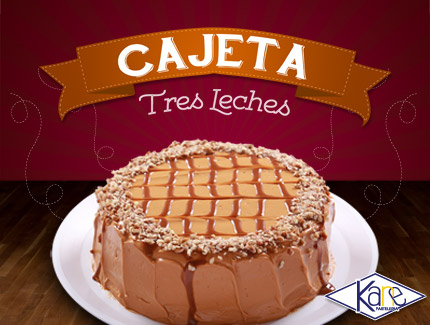 • Tres Leches de Cajeta Delicioso pastel sabor cajeta, cubierto con un original betún de dulce de leche, chorreado con cajeta y decorado con nuez molida.