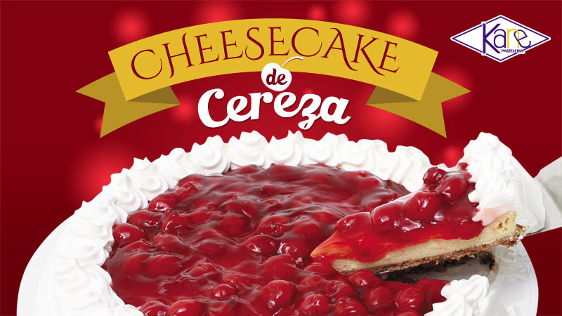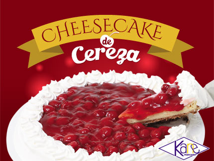 • Cheesecake de Cereza Deliciosa mezcla de quesos sobre una costra de galleta de vainilla, decorado con una capa de cerezas y un poco de betún de crema.