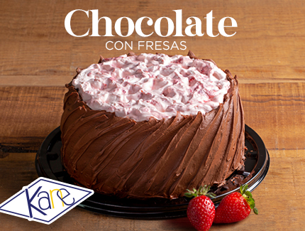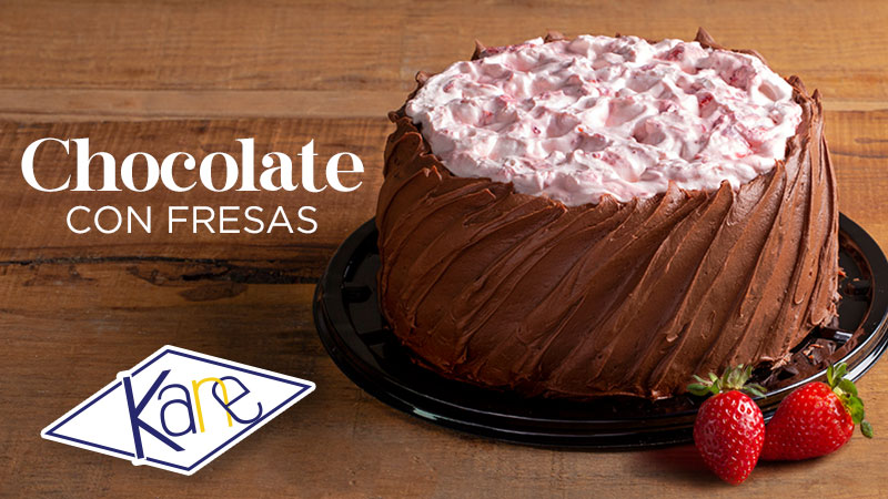 • Chocolate con Fresas Delicioso pastel de chocolate, relleno de fresas con crema, cubierto por un betún de fresas con crema y betún de chocolate, decorado con una fresa con chocolate.