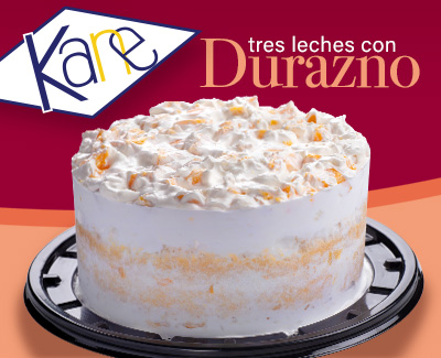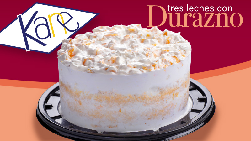 • Pastel Tres Leches con Durazno Pastel sabor vainilla, cubierto con delicioso betún elaborado a base de crema con un toque de vainilla con trozos de durazno.
