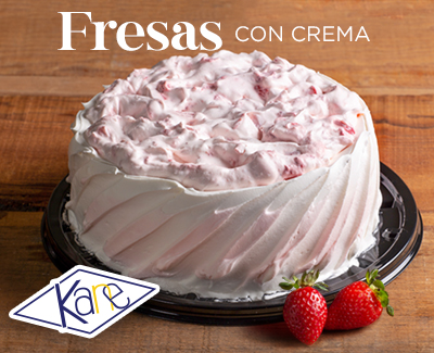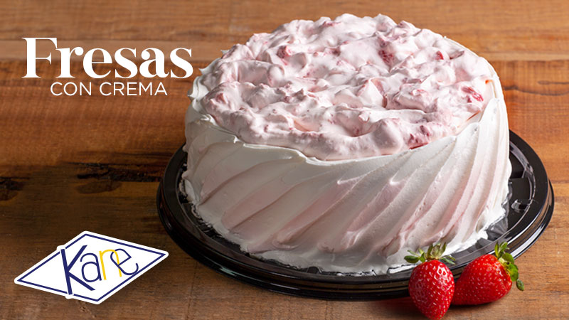 • Fresas con Crema Exquisito pastel de vainilla, bañado con fresas, relleno de fresas con crema, cubierto por betún de fresas con crema decorado con una fresa.