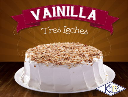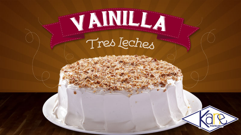 • Tres Leches de Vainilla Pastel sabor vainilla, cubierto con betún elaborado a base de crema con un toque de vainilla, decorado con nuez molida.